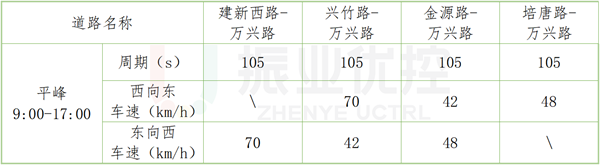 4.設計雙向綠波協(xié)調方案。平峰時段(9:00-17:00),對萬興路(培唐路-建新西路)實施雙向“變速”綠波協(xié)調控制。協(xié)調路段上下行綠波帶寬均為20秒。