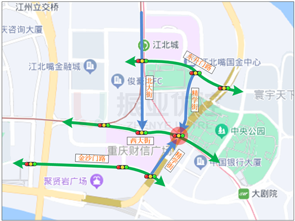區(qū)域內(nèi)交通環(huán)境復(fù)雜,路段內(nèi)無(wú)燈控路口、岔路較多,存在不可控的車(chē)流及人流干擾車(chē)輛正常行駛的情況。同時(shí)由于周邊分布江灘公園、重慶大劇院、重慶科技館、購(gòu)物中心等交通吸引點(diǎn),節(jié)假日期間,大量車(chē)流從各個(gè)方向聚往某一交通吸引點(diǎn),導(dǎo)致區(qū)域性擁堵。