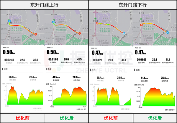 東升門(mén)路:路段上行停車(chē)次數(shù)由1次變?yōu)?次,全程耗時(shí)縮短102秒;路段下行停車(chē)次數(shù)由1次變?yōu)?次,全程耗時(shí)縮短141秒。