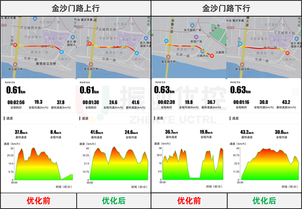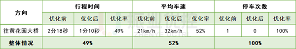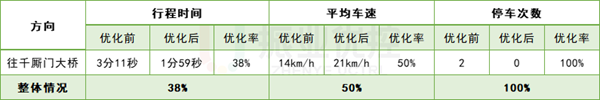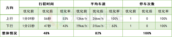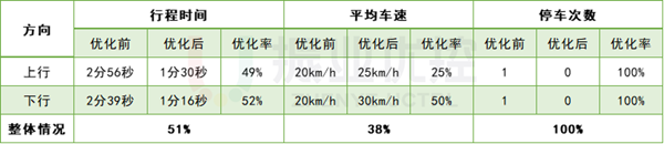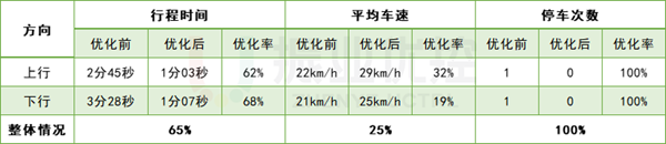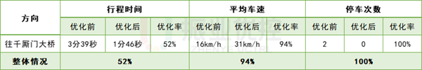 金沙門(mén)路:路段上行停車(chē)次數(shù)由1次變?yōu)?次,全程耗時(shí)縮短86秒;路段下行停車(chē)次數(shù)由1次變?yōu)?次,全程耗時(shí)縮短83秒。
