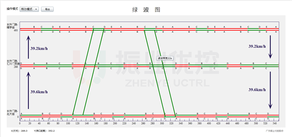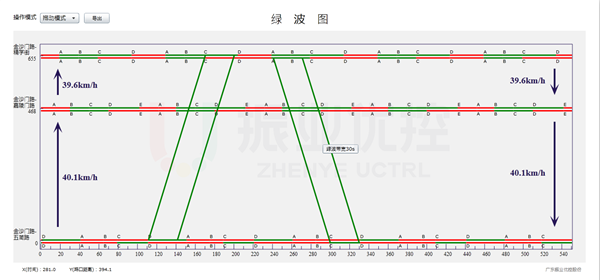 在保證路口正常運(yùn)行的情況下,將三條主要道路的周期時(shí)間統(tǒng)一為110s,協(xié)調(diào)相位差;并結(jié)合道路基礎(chǔ)條件、路段限速要求、車(chē)輛行駛特征、無(wú)燈控行人過(guò)街等因素,通過(guò)多次跟車(chē)測(cè)試,對(duì)綠波時(shí)速精細(xì)化設(shè)計(jì),達(dá)到9:30-16:30、19:30-22:30兩個(gè)時(shí)段雙向綠波效果。