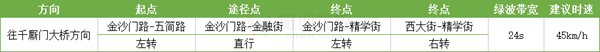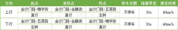線(xiàn)路一:金沙門(mén)路雙向不停車(chē),綠波帶寬30s,建議速度40km/h。