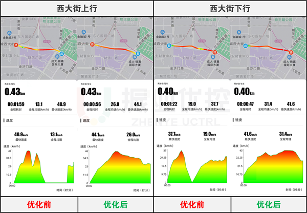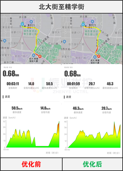五簡(jiǎn)路至精學(xué)街單向:路段停車(chē)次數(shù)由2次變?yōu)?次,全程耗時(shí)縮短113秒。
