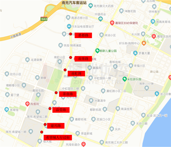 嘉南路為新建改造道路,是南充市嘉陵區(qū)南北通行的主要道路之一,全長1.9公里,分布7個路口。路段雙向8車道,設(shè)置有中央隔離護(hù)欄與非機(jī)動車道,道路條件良好,平均車速可達(dá)40km/h-50km/h。