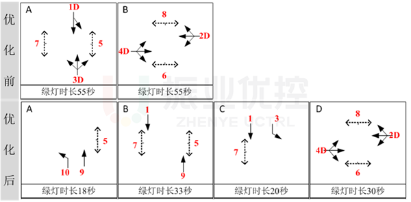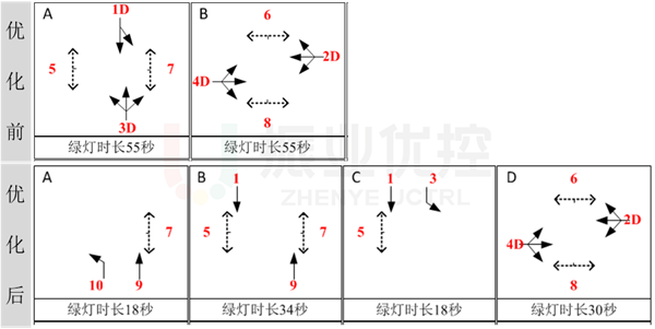 本案例中新改(擴(kuò))建的城市道路,通過優(yōu)化相位相序,將原來的簡單兩相位調(diào)整為直行-左轉(zhuǎn)搭接相位相序,減少沖突和延誤;并根據(jù)車流量變化情況,調(diào)整配時,減少支路空放情況,提高綠燈利用率;同時將上下游路口進(jìn)行聯(lián)動綠波協(xié)調(diào),讓信號燈更智能,進(jìn)一步提升通行效率。