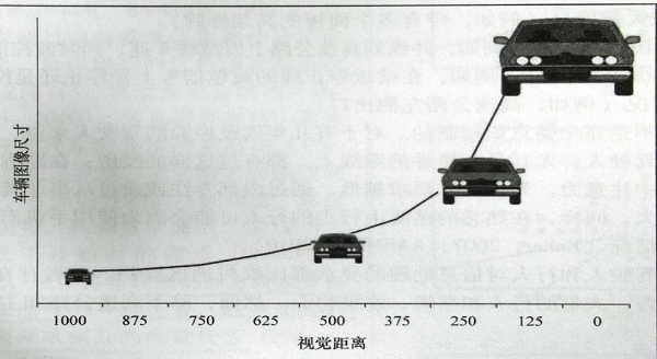 而基于視覺的生物特性,因?yàn)橐曈X距離和車輛圖像大小之間的關(guān)系并非線性關(guān)系,從而增加了道路使用者估算速度的難度,特別是當(dāng)車輛所占視角的變化速率小于0.2度/秒時(shí),觀察者無法檢測到圖像大小在變化(如圖1)。