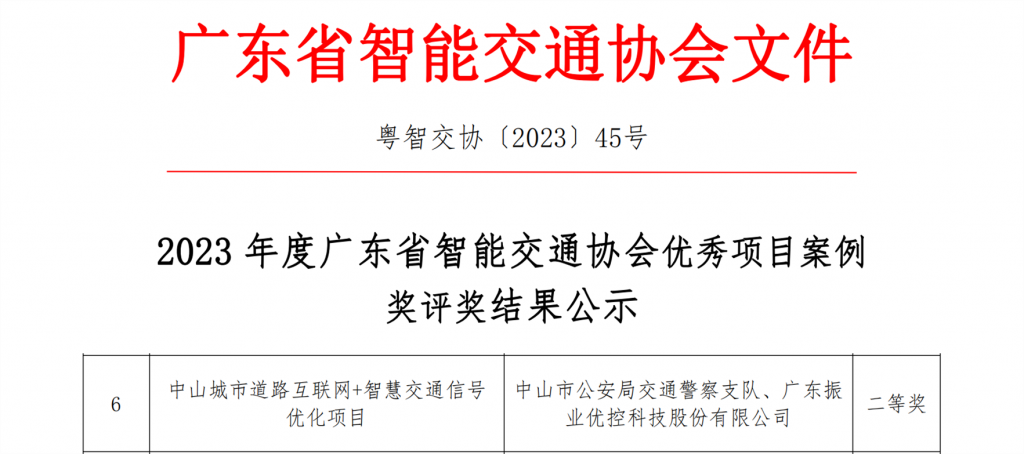 近日,廣東省智能交通協會公布了“優(yōu)秀項目案例獎”獎項名單,中山市公安局交通警察支隊與振業(yè)優(yōu)控共同完成的“中山城市道路互聯網+智慧交通信號優(yōu)化項目”榮獲二等獎,獲專業(yè)肯定。