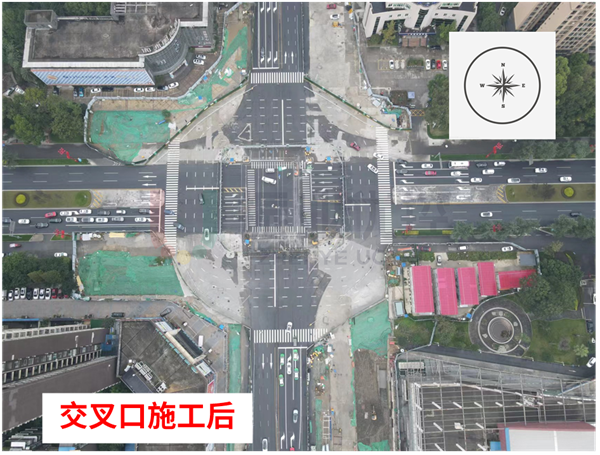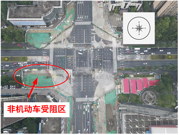 西進(jìn)口占道封閉擋板后移,保留原有非機(jī)動(dòng)車車道和過(guò)街等候區(qū),規(guī)范機(jī)動(dòng)車與非機(jī)動(dòng)車的通行軌跡,減少非機(jī)動(dòng)車進(jìn)入機(jī)動(dòng)車道通行產(chǎn)生的延誤。