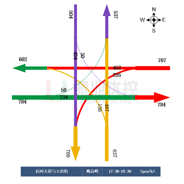 擁堵主要集中在晚高峰時(shí)段,根據(jù)車流量數(shù)據(jù)統(tǒng)計(jì),晚高峰時(shí)段每小時(shí)通行流量高達(dá)2632輛,其中,東進(jìn)口左轉(zhuǎn)與西進(jìn)口直行的車流量較大。