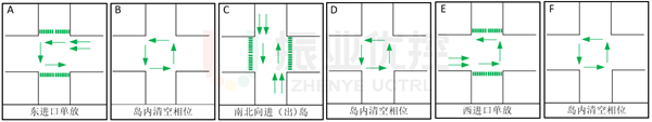 但6個(gè)控制相位中,其中3個(gè)相位是清空相位,只放行交叉口內(nèi)車流,每個(gè)相位為12秒。由于全紅時(shí)間設(shè)置不合理,清空功能沒(méi)有發(fā)揮效果的同時(shí),降低了交叉口通行效率。