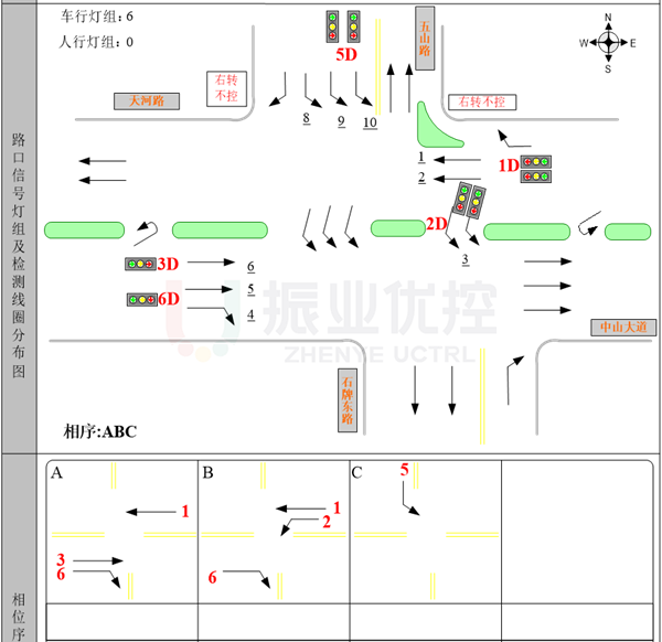 按路口渠化改造情況,原信控方案三相位調(diào)整為六相位??紤]到路口增設非機動車及行人過街后,方案相位變化較大、各進口等待時間增加等情況,非機動車采取一次過街設計,行人過街采取二次過街設計。