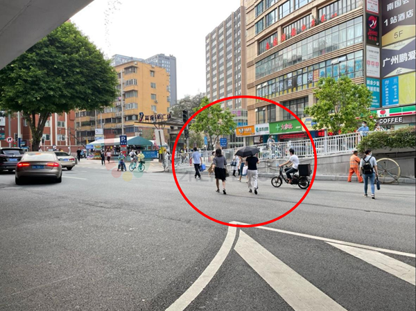 因路口日常非機動車與行人的流量較大,設置了過街天橋,但過街天橋使用率較低。路口西側(cè)行人橫穿馬路、非機動車穿行情況頻發(fā),與機動車互相干擾,險象環(huán)生,存在較大的安全隱患。