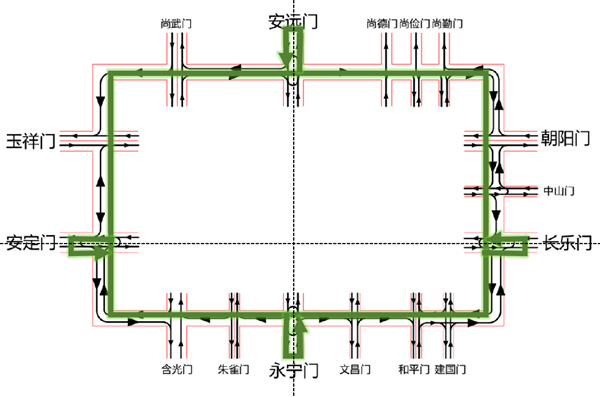 (2)非機(jī)動(dòng)車(chē)——“慢行優(yōu)先,通行連續(xù)”打造順城巷騎行環(huán)路。一是在路段保證非機(jī)動(dòng)車(chē)通行空間;二是明晰交叉口非機(jī)動(dòng)車(chē)通行規(guī)則,主城門(mén)處非機(jī)動(dòng)車(chē)逆時(shí)針城外繞行通行(與機(jī)動(dòng)車(chē)流線保持一致);三是在其他城門(mén)內(nèi)側(cè)開(kāi)放隔離欄,施劃行人和非機(jī)動(dòng)車(chē)過(guò)街設(shè)施。