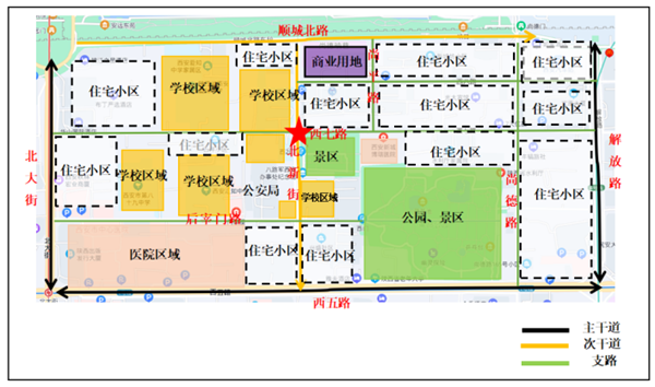 路口概況:北新街與西七路十字位于西安市新城區(qū),“隱藏”于老城片區(qū)內(nèi)的背街小巷當(dāng)中。北新街為南北雙向4車(chē)道的次干路,西七路為東西雙向2車(chē)道的支路,承擔(dān)著片區(qū)內(nèi)居民交通出行的集散功能,是片區(qū)路網(wǎng)的交通“關(guān)鍵節(jié)點(diǎn)”。