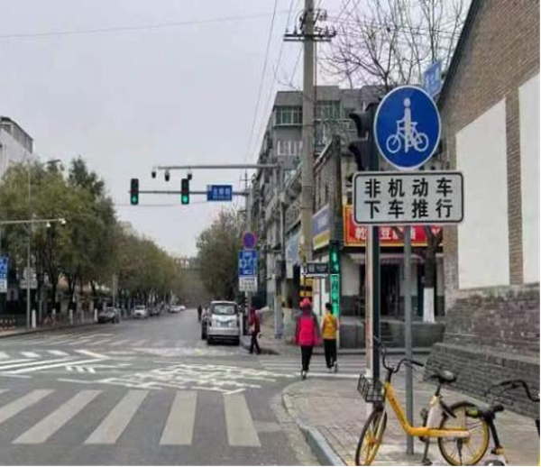 (2)引導(dǎo)非機(jī)動(dòng)車(chē)過(guò)街“下車(chē)推行”,增設(shè)非機(jī)動(dòng)車(chē)下車(chē)推行指示標(biāo)志和輔助標(biāo)志。