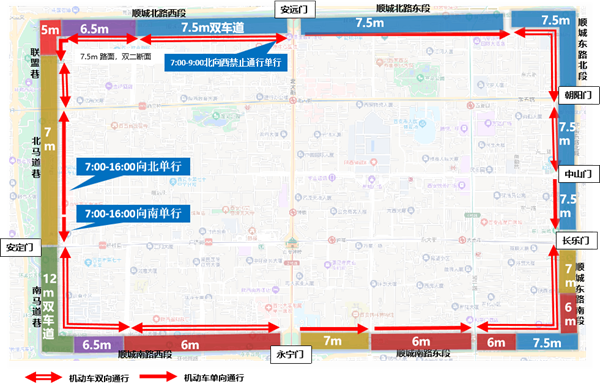 治理成效:對(duì)全段交通組織進(jìn)行整體優(yōu)化后,在保障各類(lèi)交通參與者合理路權(quán)的基礎(chǔ)上,統(tǒng)籌了周邊居民出行與游客出游,兼顧“行”與“?!钡挠斡[理念,最大程度消除了順城巷通行阻力,為居民打造了“永安”入(永寧門(mén)、安遠(yuǎn)門(mén)),“長(zhǎng)安”出(長(zhǎng)樂(lè)門(mén)、安定門(mén))的機(jī)動(dòng)車(chē)流線和綠色慢行示范路段,便于在有限的時(shí)間內(nèi)暢游順城巷。