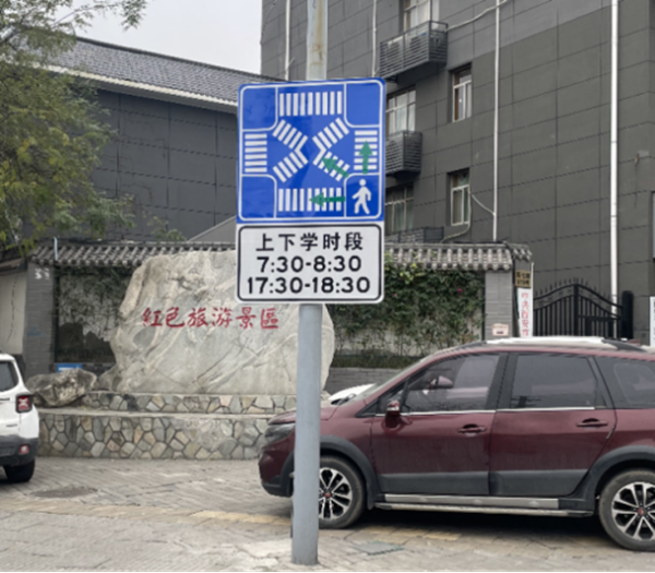 治理措施:(1)設(shè)置時(shí)段性行人全向通行通道,在交叉口施劃上下學(xué)高峰時(shí)段限時(shí)全向行人通道標(biāo)線,并配套提示標(biāo)志和告示標(biāo)志加以引導(dǎo),提高行人過(guò)街效率。