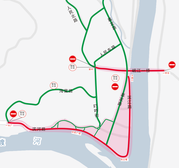 19:00至22:00,在新村路口、岷江一橋東端路口分別設(shè)置管制點(diǎn);20:30至21:30,在濱河路-濱江路一線設(shè)置多處管制點(diǎn)。