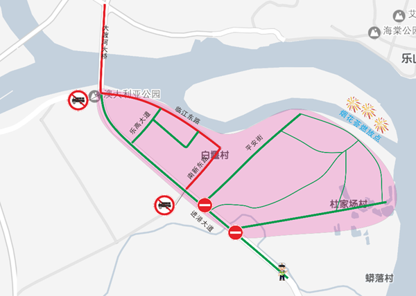 高新區(qū)觀賞區(qū)中杜家場村最靠近煙花表演燃放點(diǎn),吸引了諸多群眾前往。為確保杜家場村附近道路通暢,19:00至21:30,在進(jìn)港大道-杜家場村路口、平安村路口設(shè)置管制點(diǎn);大渡河大橋、臨江東路實(shí)施限時(shí)禁行,禁止貨運(yùn)車輛通行。
