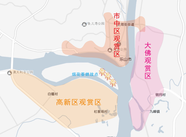 本次活動(dòng)觀賞區(qū)分為大佛景區(qū)、市中區(qū)與高新區(qū),活動(dòng)前后,三個(gè)觀賞區(qū)域的沿江觀賞道路進(jìn)行臨時(shí)交通管制。