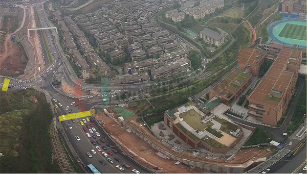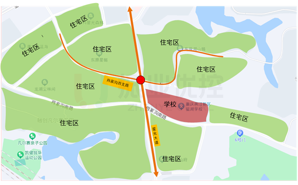 星光大道-肖家溝西支路位于重慶市兩江新區(qū)照母山片區(qū),北接金州大道,南連照母山隧道至照母山立交、新南路上跨橋等重要交通節(jié)點路口。路口東南角緊臨星湖學校,周邊多為大型住宅區(qū);北側(cè)星光大道南往北單行。