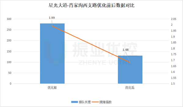 晚高峰南進口車流排隊長度從280米縮短至130米,下降了53.5%,通行效率提升了20%;路口擁堵指數(shù)由1.99下降至1.68,下降了15.58%。