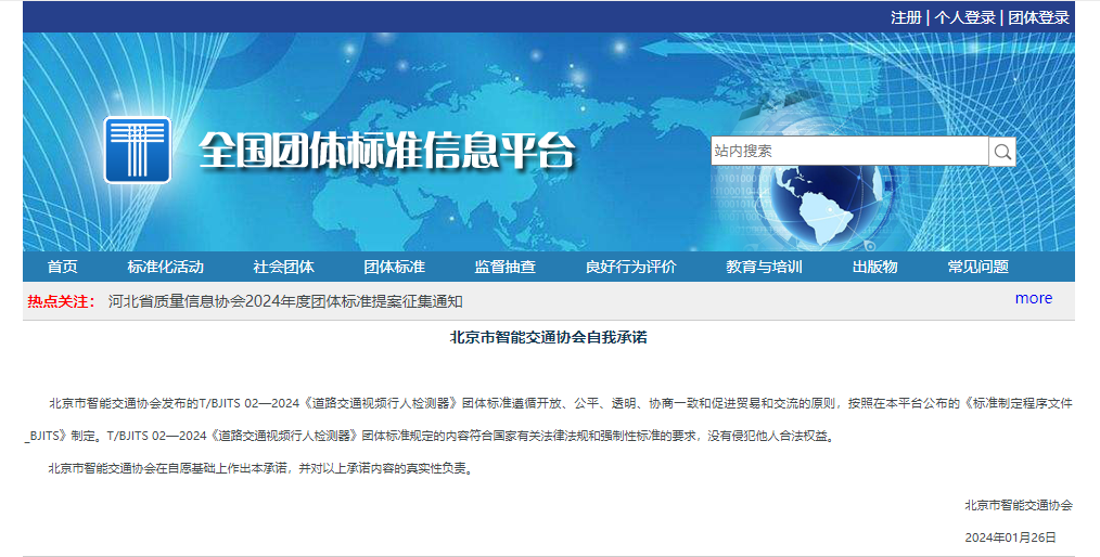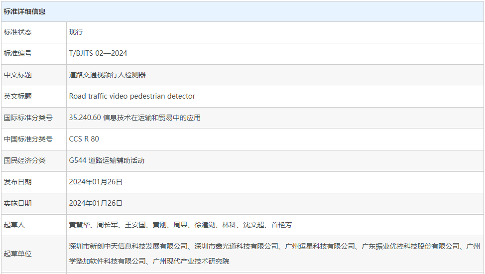 2024年1月26日,經(jīng)北京市智能交通協(xié)會(huì)審批,T/BJITS 02—2024《道路交通視頻行人檢測(cè)器》團(tuán)體標(biāo)準(zhǔn)正式發(fā)布并實(shí)施。該團(tuán)體標(biāo)準(zhǔn)由廣東振業(yè)優(yōu)控科技股份有限公司、深圳市新創(chuàng)中天信息科技發(fā)展有限公司、深圳市鑫光道科技有限公司、廣州運(yùn)星科技有限公司、廣州學(xué)塾加軟件科技有限公司等大灣區(qū)智慧交通創(chuàng)新聯(lián)盟單位以及廣州現(xiàn)代產(chǎn)業(yè)技術(shù)研究院聯(lián)合起草編制,是視頻行人檢測(cè)技術(shù)在道路應(yīng)用場(chǎng)景方面的國(guó)內(nèi)首個(gè)團(tuán)體標(biāo)準(zhǔn)。