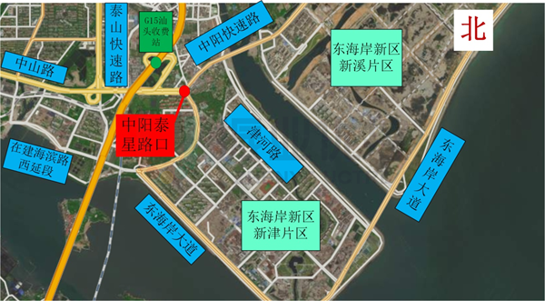 中陽(yáng)大道為城市主干道路,主線雙向六車道,輔道雙向四車道,是貫穿汕頭中心城區(qū)和新東區(qū)、澄海區(qū)的重要通道。中陽(yáng)泰星路口為新東區(qū)往返汕頭中心城區(qū)的重要節(jié)點(diǎn)路口,早晚高峰存在潮汐現(xiàn)象,南進(jìn)口上班上學(xué)往返車流量較大,西進(jìn)口下班返程車流聚集快。