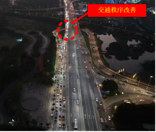 中山東路下匝道與主路分流點(diǎn),機(jī)動(dòng)車之間搶行現(xiàn)象、交通事故基本消除,交通秩序改善。