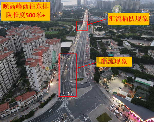 晚高峰時(shí)段,西進(jìn)口車流聚集較快,現(xiàn)有車道通行能力難以及時(shí)消散大量聚集車流,呈現(xiàn)過(guò)飽和狀態(tài)。另外,由于該進(jìn)口段存在小區(qū)出入口車流干擾,出現(xiàn)車流“斷流”與排長(zhǎng)隊(duì)現(xiàn)象,排隊(duì)長(zhǎng)度超過(guò)500米,經(jīng)常排隊(duì)到中山東路下匝道處,影響主路正常通行。