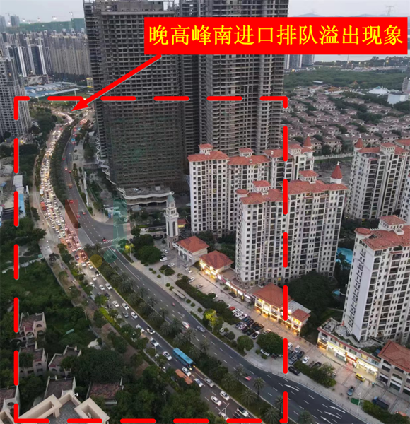 晚高峰17:40-18:20時(shí)段,受東海岸片區(qū)中小學(xué)放學(xué)影響,南進(jìn)口接送車流量(返程市區(qū))激增,排隊(duì)車流頻繁溢出至阿里山泰星路口。