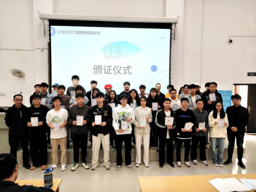 活動上,陳建球博士為取得交通信號優(yōu)化工程師(初級)資格的同學(xué)頒發(fā)證書。該證書證明他們基本掌握交通信號優(yōu)化相關(guān)知識,對該領(lǐng)域有較為全面的了解,具備交通信號優(yōu)化基本業(yè)務(wù)執(zhí)行與日常操作的能力。